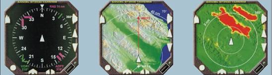 В восьмидесятые годы на смену механическим пилотажно-навигационным приборам пришли электронные (EFIC – electronic flight instrumentation system), такие, как авиагоризонт (artificial horizon), авиакомпас {flight director) и индикатор горизонтального положения (HSI – horizontal situation indicator). Обычно они размещались там же, где и приборы, на смену которым они пришли, и первоначально исполнялись в раздельных корпусах со стеклянной лицевой панелью. Постепенно электронные приборы начали «осваивать» новые., дополнительные функции: определение положения на линии курса, определение данных об облачности и грозовой обстановке, получение рекомендаций по движению, а также информации о контрольных точках по маршруту, вплоть до отображения на дисплее курса захода на посадку и зоны ожидания посадки.