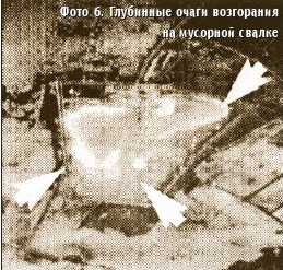 На фото 3 совмещены два кадра, сделанные при полете вертолета над очагом пожара на высоте около 200 м с интервалом 25–30 минут. Снимок дает точное представление о направлении распространения огня подземного пожара на глубине 3–5 м. Без соответствующего оборудования же ничего, кроме плотного слоя дыма, увидеть невозможно.