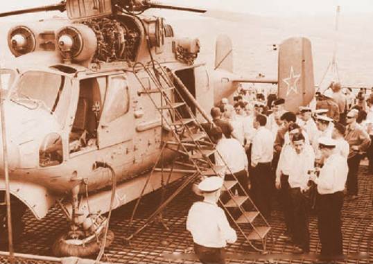 Проходили (а не проплавали) мы всего 175 из запланированных 270 суток. Несколько раз пересекали экватор, и ни разу за все это время не видели земли. Поход завершился в сентябре 1967 года торжественной встречей в Североморске. Сам командующий Северным Флотом со свитой встречал экспедицию, а нас, вертолетчиков, ждал … бюллетень, предписывающий доработку системы управления. Ее обязательно нужно было выполнить и только тогда лететь на материк.