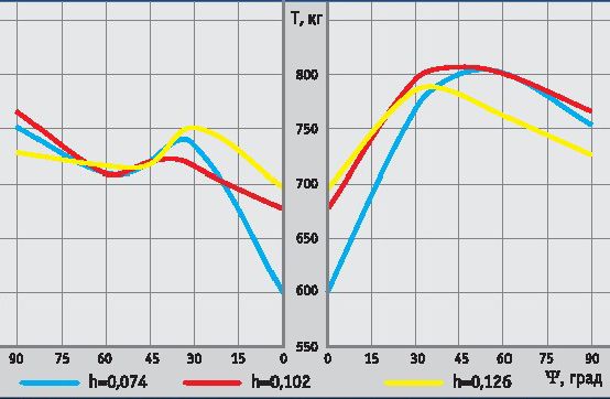 В испытаниях было выявлено существенное влияние на характеристики винта углового положения пар лопастей относительно друг друга. На рис. 2 показано изменение тяги винта в зависимости от азимутального положения лопастей при значении относительного расстояния h=h/R=0,074 между плоскостями вращения модулей винта (приведена размерная тяга винта, чтобы было понятно, каков порядок сил, развиваемых винтом).