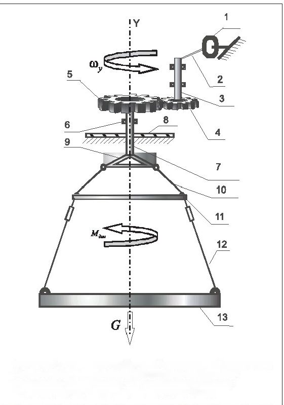 1-кольцевой тензо динамометр; 2-рычаг; 3-промежуточный вал привода; 4,5-зубчатая цилиндрическая передача; 6-упорный подшипник; 7-выходной вал САО; 8-стойка; 9-переходное звено; 10-канат; 11 — распорная балка; 12-канат внешней подвески; 13-груз