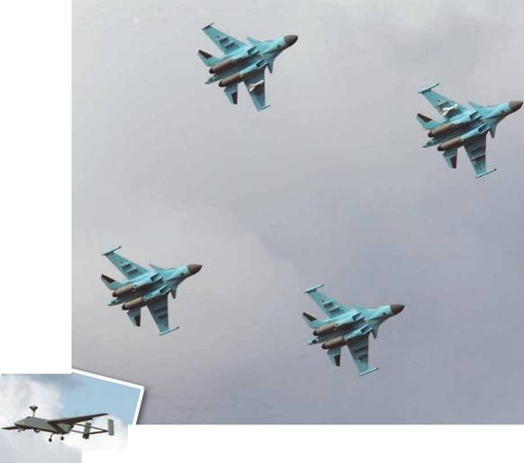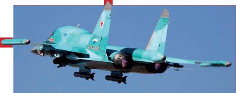 В это же время на старт выруливает четверка липецких бомбардировщиков Су-34. Их цель — хорошо укрепленные командные пункты и замаскированные ЗРК противника. Для этого на внешних узлах подвески самолетов установлены высокоточные боеприпасы — по две управляемые ракеты Х-29Л или корректируемые бомбы КАБ-500Кр. Скрытно выйдя на малых высотах в район боевого соприкосновения сторон и нанеся одновременный удар высокоточным оружием по четырем выявленным целям, российские летчики должны уничтожить противника. После выполнения основной задачи, экипажам предстоит провести доразведку целей и доложить о полученных результатах на командный пункт.