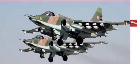 Стартуют Су-25СМ, вооруженные штурмовыми авиабомбами ФАБ-500ШЛ