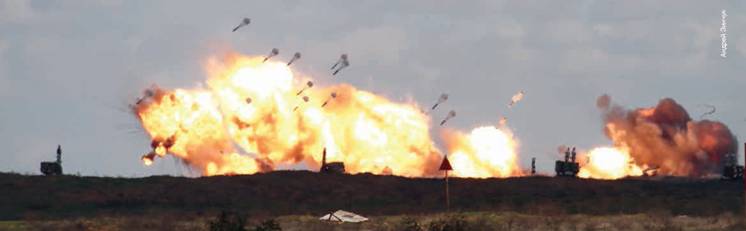 Активная фаза учений с каждой минутой набирает обороты. Вот уже с «Приволжского» в небо поднялись командированные на время учений из Буденновска 12 штурмовиков Су-25СМ, под крылом которых — по 4–6 неуправляемых ракет С-24Б или четыре бомбы ФАБ-500ШЛ, а с аэродрома «Мариновка» — четыре фронтовых бомбардировщика Су-24М с четырьмя осколочно-фугасными бомбами ОФАБ-250-270 каждый. Нетрудно подсчитать, какая общая масса боеприпасов должна вскоре обрушиться на землю, отсекая отходящие войска от наседающего противника. А тем временем к воздушному пространству над полем боя приближалась тройка дальних бомбардировщиков Ту-22МЗ. Взлетев с авиабазы под Саратовом, они преодолели чуть менее полутысячи километров, неся «неприятный подарок» противнику в виде 24 бомб ФАБ-1500.