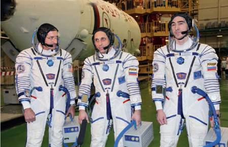 Экипаж «Союза ТМА-22» (слева направо): Дэниел Бёрбанк, Антон Шкаплеров, Анатолий Иванишин