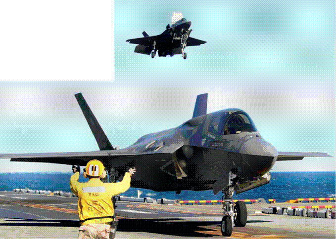 Испытания опытных F-35B на борту универсального десантного корабля «Уосп», октябрь 2011 г.: BF-4 только что совершил вертикальную посадку на палубу, BF-2 заходит на посадку