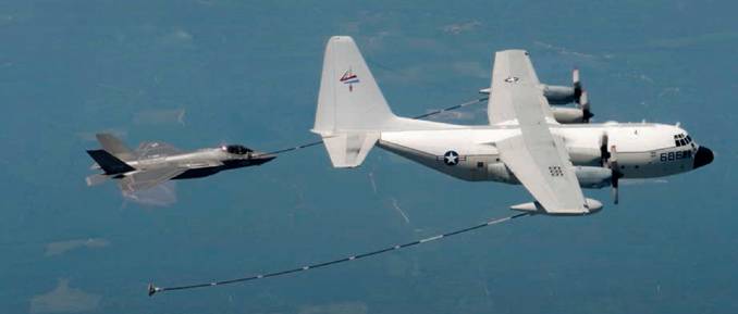Отработка дозаправки топливом в полете опытного корабельного истребителя F-35C (CF-3) от танкера KC-130