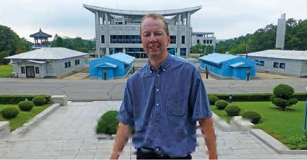 Автор репортажа в Демилитаризованной зоне на границе с Южной Кореей. Ее территория начинается сразу за бетонным бордюрчиком, который можно видеть ровно посередине между голубыми и серыми бараками (служат для проведения переговоров представителей двух стран при обострении обстановки). Крупное здание на заднем плане – уже Республика Корея