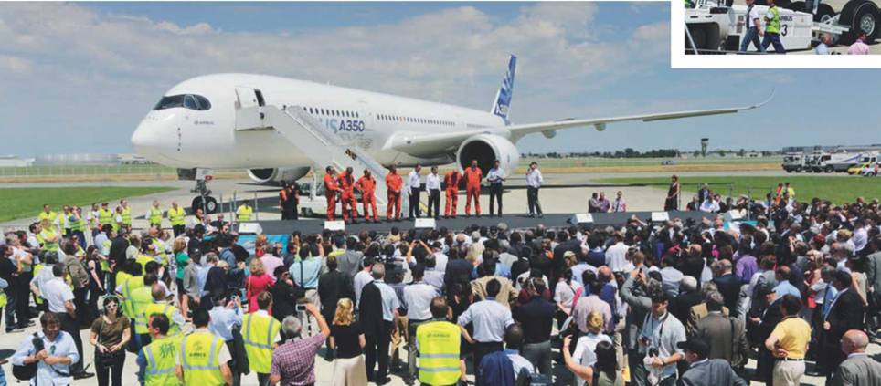 В свой первый полет из аэропорта Тулуза-Бланьяк первый A350XWB поднялся ровно в 10 утра 14 июня — точно тогда, как это было заранее объявлено производителем. Надо отдать должное Airbus: первый полет новейшего лайнера не держался в секрете, как это чаще всего бывает у нас, и был обставлен в самой торжественной обстановке. Помимо тысяч работников компании и предприятий-смежников, присутствовавших на событии непосредственно, его могли наблюдать с помощью прямой онлайн-трансляции в интернете в реальном масштабе времени все желающие. И не будет преувеличением сказать, что ими оказались миллионы людей по всему миру. Отличная пиар-акция Airbus и точно подгаданная дата первого полета накануне авиасалона в Ле-Бурже дали свои плоды: несмотря на физическое отсутствие А350 на выставке, он стал одной из самых обсуждаемых ее тем, а производитель смог ощутимо пополнить и без того немалый портфель заказов на новинку.