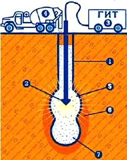 Цифрами на схеме обозначено: 1— скважина до обработки; 2— электродная система; 3— генератор импульсных токов; 4— бетононасос; 5— зона цементации грунта; 6— зона уплотнения грунта; 7— камуфлетное расширение в основании сваи.