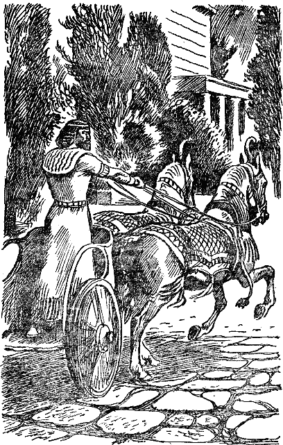 Грохочущая колесница въехала в узкие ворота и остановилась под широким навесом, где лошади, стоя на привязи, жевали охапки свежескошенной травы.