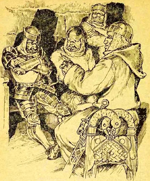Слуги, накрывавшие столы, ругались и бранились, и беспрерывно сыпались удары на тех из них, которые по своему положению и возрасту могли считаться низшими. Одетые в кольчуги, вооруженные, они скорей напоминали воинов, собравшихся в поход, чем слуг, готовящих стол для пиршества. Половина их были пьяны.