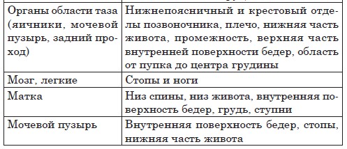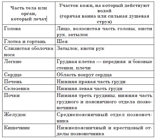 Итак, душ – это замечательное терапевтическое средство. Упругие струи горячей воды, направленные на тело, действуют на нервные окончания, которые через рефлекторные дуги связаны с различными внутренними органами. Когда горячая вода воздействует на кожу, в рефлекторных дугах образуются нервные импульсы. Это действие можно сравнить с действием электрического тока, который возникает в цепи после поворота выключателя. Таким образом, воздействуя на определенные участки кожи горячей водой, можно лечить и органы, рефлекторно связанные с ними. Внимательно посмотрите таблицу.