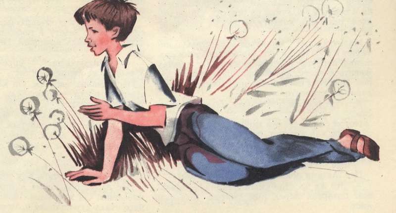 Мальчик чуть улыбнулся. Щелкнул замком чемодана и поднял крышку. Пес сделал еще шаг, торопливо сел, наклонил голову и совсем по-человечьи моргнул. Мальчик вынул газетный сверток с дорожным запасом. Это были два ломтика хлеба, а между ними— котлета. Песий хвост завертелся, замелькал, как пропеллер, с пушистых одуванчиков стайками взлетели семена-парашютики и осели у мальчика на брюках. Он засмеялся, разломил котлету и бросил половину псу.