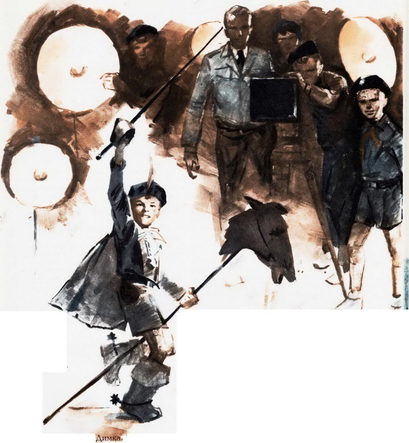 На длинной бумажной ленте нарисовали дорогу — с деревьями, каменными горбатыми мостиками, мельницами и старинными островерхими домиками. Эту ленту засняли на кинопленку. А потом на фоне белой стены сняли на ту же пленку скачущего Андрюшку. Это комбинированная съемка. Получилось, что Андрюшка скачет по дороге.