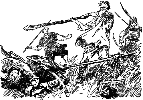 На месте, где стоял слепой боец, завязалась жестокая схватка. Лутоня вертелся на месте с неожиданным проворством; длинная дубина образовала, вращаясь, страшный круг, в который никому не было доступа. Воинственные крики старика, вопли и стоны умирающих, лязг оружия – все смешалось в жуткую музыку боя. Лутоню издали кололи копьями, задевали мечами, но страх мешал царским дружинникам нанести слепому богатырю смертельную рану. А тот, вдруг прыгнув вперед, ударами тяжелой дубины разбивал головы, крушил врагам ребра…