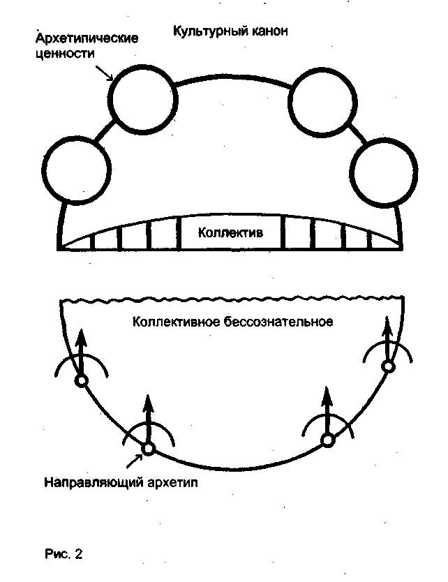 На рис. 2 вы найдете диаграмму "сбалансированной' цивилизации, показывающую единство коллектива и эпохи с культурным каноном. Полукруг -это арка, поддерживающая высшие ценности времени, символы, образы, идеалы, составляющие надличностную среду, в которой находятся корни психико-духовного бытия коллектива. Архетип коллективного бессознательного связан с каждой из этих высших ценностей. И мы можем сказать, что глубина и сила архетипа, постигаемого посредством его проекции на высшую ценность культурного канона, соизмеримы с его положением на небесной арке.