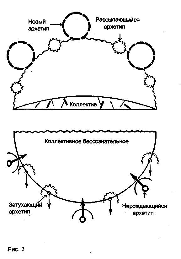 Диаграмма на рис. 3 представляет распад культурного канона, характерный для нашего времени и предшествовавших ему двух веков. Было утрачено равновесие противостояния в психическом поле. На моем рисунке формирующий канон архетип выглядит постепенно растворяющимся. Соответствующие ему символы распадаются, а арка обрушивается, поскольку лишилась основания. Точно так же, как пчелиный рой погружается в хаос и панику, стоит только уничтожить его центральную власть, воплощенную в королеве роя, так и разрушение культурного канона приводит к хаосу и панике в обществе