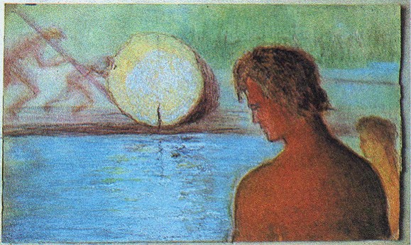 По вечерам, сначала для отдыха, потом все более увлеченно Бартини писал научно-фантастическую киноповесть «Цепь». Его рисунки к «Цепи». Аллегория: единство Вселенной. Племя покинуло поселок, затопленный при наводнении.