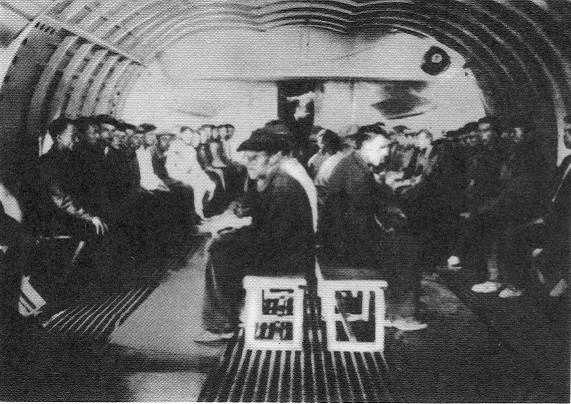 Размещение людей в десантно-транспортном самолёте Т-117. Фотографу позируют рабочие сборочного цеха.