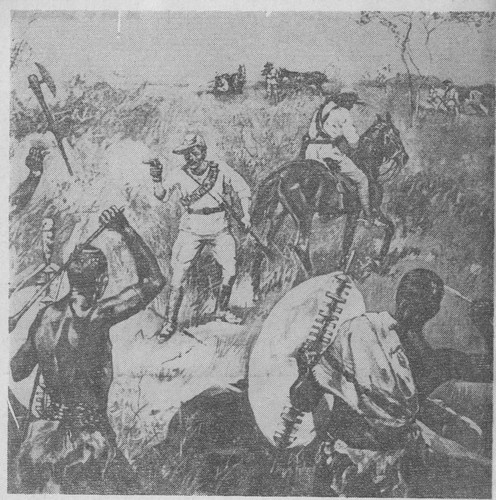 Эпизод народного восстания в Южной Родезии. Фрагмент зарисовки боя 22 апреля 1896 года (из книги О. Рэнсфорда «Булавайо»: места исторических битв в Родезии. Кейптаун, 1968).