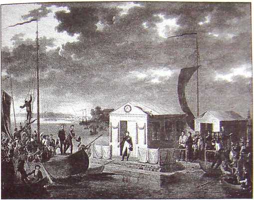 Ф.В. Булгарин в своих "Воспоминаниях" пишет: "Наполеон прибыл несколькими минутами прежде на паром, и подал императору нашему руку <…>. Рука об руку, они вошли в павильон в виду многочисленных зрителей, которыми усеяны были оба берега…