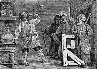 И случилось однажды родителямъ уйти въ поле на работу крестьянскую, и остался Илья одинъ-одинешенекъ дома. Сидитъ онъ на печи — думу свою думаетъ, и вдругъ слышитъ, что стучится къ нему кто-то въ окошечко косящетое. «Кто тутъ, добрый человкъ, отзовися!» — окликаетъ съ печи Илья Муромецъ. И слышитъ онъ, что въ отвтъ ему откликаются подъ окномъ три голоса: «Охъ ты гой еси, Илья Муромецъ, крестьянскій сынъ, отворяй скоре намъ ворота широкія, впускай насъ, калкъ, къ себ во дворъ». — Отвчаетъ имъ съ печи Илья Муромецъ: «Ай-же вы, калки перехожіе! Не могу я съ печи встать, не могу я вамъ вороты отворить — сижу я здсь сиднемъ цлыя 30 лтъ: не владаю ни руками, ни ногами». И опять слышитъ онъ подъ окномъ: «Вставай, Илья, на рзвы ноги, отворяй намъ ворота, впускай насъ на широкой дворъ!»