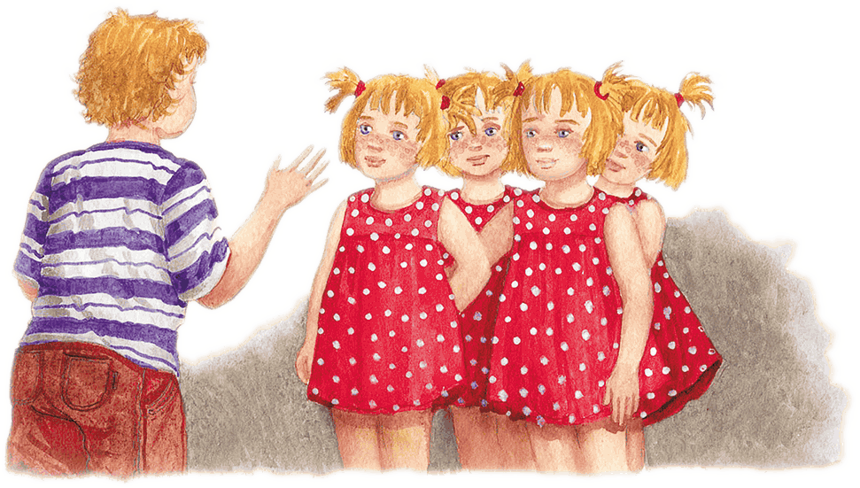 Тим в растерянности смотрел на Таську: на одну, на вторую, на третью, на двенадцатую. И голова у него начинала как будто кружиться. Все Таськи смотрели на него одинаковым взглядом – испуганным, выжидающим, умоляющим. У всех в глазах были слёзы. И все примолкли – наверное, потому, что каждое слово оказалось бы в то же мгновение повторено хором. Настоящая Таська не могла даже подсказать: «Вот я!» – потому что одновременно с ней и остальные сказали бы то же самое, точно такими же голосами.