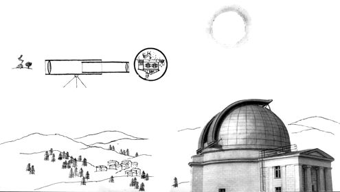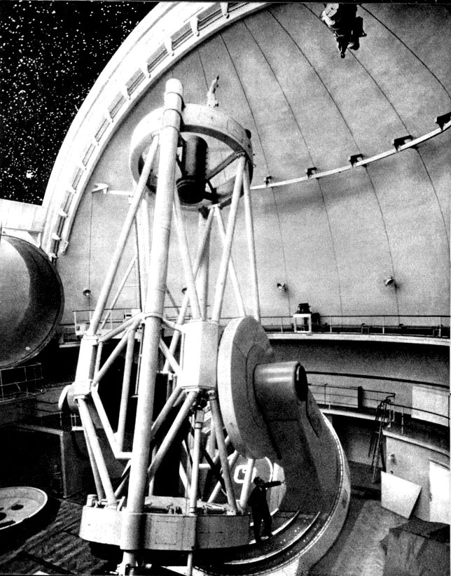 Настоящие телескопы устроены, конечно, гораздо сложнее, но основа их та же. Трубу телескопа делают подвижной и устанавливают во вращающейся башне, для того чтобы её можно было направить в любую точку неба. Одна такая башня показана на этой фотографии. Телескопы обычно устанавливаются на прочном фундаменте, где-нибудь на возвышенности или в горах.