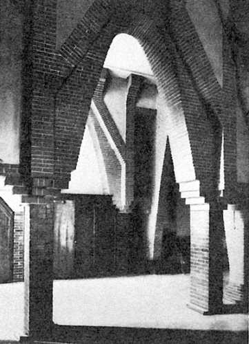 По обеим сторонам двора-коридора располагаются дополнительные коридоры, образованные близко располагающимися друг к другу параболическими арками, сделанными из малоформатного прессованного кирпича, отделанного белым алебастром. Ту же конструкцию мастер использует и в стилевом решении архитектуры третьего этажа.