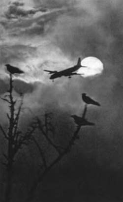 Над землей снег, самолет все равно ищет. Густо за снежною пеленой нарастает звук. Низко проходит. Дрожит стекло. Галки на сухой ветке испуганы и готовы взлететь. Низкие облака. Самолет затихает — благополучно повстречался с землею. Новый гудит, ищет землю. Блеснуло солнце на полминуты, и опять снег, снег…