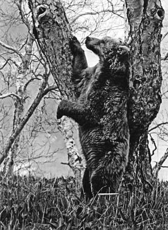 Но я уже на медвежат не глядел. Чуть в стороне под березой выскочила и стала на задние лапы медведица. Огромная! Морда у нее дружелюбная, как в зоопарке. Нижняя челюсть немного отвисла от любопытства и напряжения, передняя правая лапа согнута и прижата к груди. У меня одна только мысль: скорее снимать, сейчас испугается и убежит. Навожу, нажимая спуск…