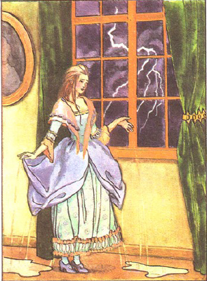 Как-то к вечеру разыгралась страшная буря; сверкала молния, гремел гром, дождь лил как из ведра, ужас что такое! И вдруг в городские ворота постучали, и старый король пошел отворять.