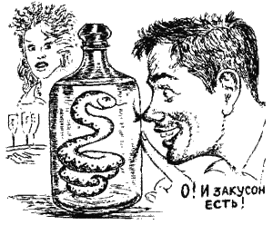 Не пугайтесь, больше не буду о червяках и змеях. Пиявовкой у нас называли обыкновенный ванильный ликер, хотя не уверена, что он уж такой обыкновенный. Делать его довольно просто: стакана два сахарного песку подрумянить, чтобы получилась карамель, влить поллитра спирта, поджечь, прикрыть крышкой, затем вылить в бутылку, куда уже брошена палочка ванили. Именно она, черная ванильная палочка, вылитая оголодавшая пиявка, и дала название напитку. Сладкий он был ужасно, густой и очень крепкий. Можно, конечно, развести водой до нужной крепости, но помню, что у нас пили его с восторгом даже те, кто признавал только сухие вина.