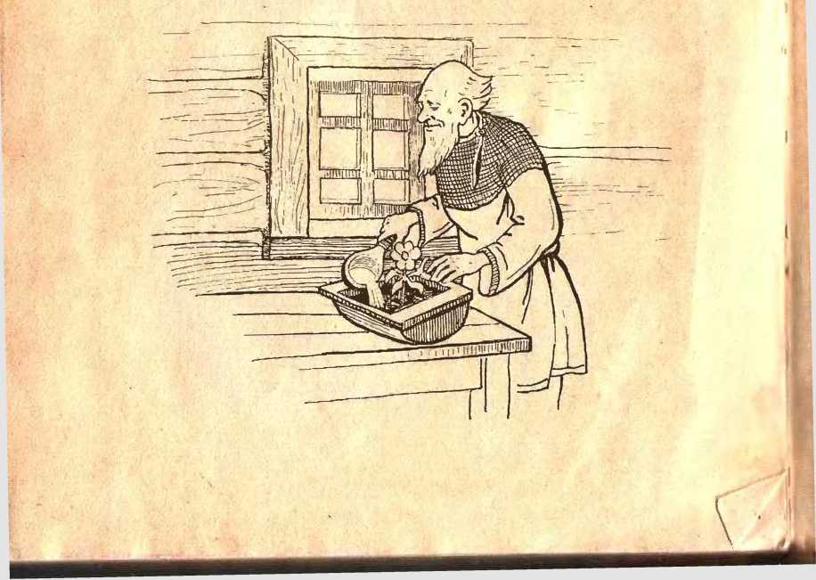 Нежной его красотою пленясь, осторожно он вырыл С корнем его. и в избушку свою перенёс, и в корытце Там посадил, и полил водой, и за милым цветочком Начал ухаживать. Что же случилось? С той самой минуты Всё не по-старому стало в избушке; чудесное что-то Начало деяться в ней: проснётся старик —а в избушке Всё уж как надобно прибрано; нет нигде ни пылинки.