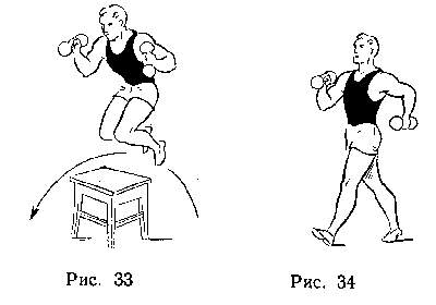 88-е упражнение (рис. 33). Прыжки через препятствия с одной и двух ног. Для мышц всего тела и дыхательной системы.