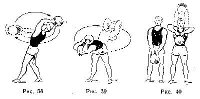 9-е упражнение (рис. 38). Круговое движение гирей двумя руками (как вращение молота в легкой атлетике). Для мышц туловища и рук.