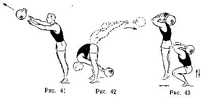 15-е упражнение (рис. 42). Махом бросить гирю через голову назад. Для мышц спины, брюшного пресса и рук.