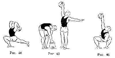 23-е упражнение (рис. 45). Выбрасывание гири одной рукой сбоку. Для косых мышц живота, спины и рук.