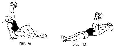 25-е упражнение (рис. 47). Ложиться и вставать с гирей, поднятой вверх одной рукой (вначале правой). Для мышц всего туловища и ног.