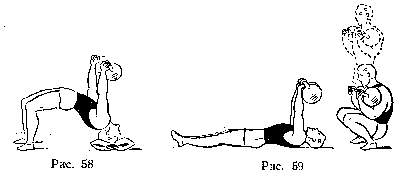 44-е упражнение (рис.58). Жим двух гирь стоя на «мосту». Для мышц шеи, туловища и рук (под голову подложить что-нибудь помягче).