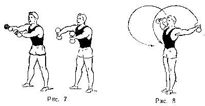 Примечание. Упражнения с гантелями для лиц, занимающихся плаванием, можно повторять большее количество раз, давая задания сделать 3-4 подхода, по 10-30 выполнений за подход, и давая задания на время и скорость (определяя темп метрономом).