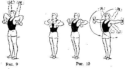 Примечание. Приведенные выше упражнения предназначены главным образом для развития мышечной силы рук, дельтовидных и грудных мышц. Упражнения можно проделывать на месте и в движении. Разумеется, кроме упражнений лежа и в упоре. Дыхание должно быть равномерным, ритмичным, без задержки. Вдох через нос, выдох через рот. Вдох обычно производить при поднимании рук в стороны-вверх; выдох — при опускании рук вниз. В упражнениях лежа дышать так же. В упражнениях в упоре при опускании вдох, при отжимании выдох.