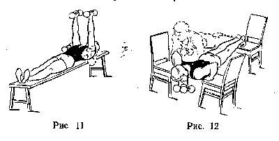 33-е упражнение (рис. 11). Жим гантелей лежа на спине. Для разгибателей рук и грудных мышц.