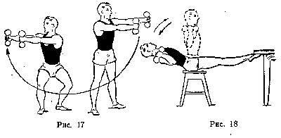 48-е упражнение (рис. 17). «Косарь». Ритмическое полуприседание с маховыми движениями рук. Для мышц туловища, ног и рук.