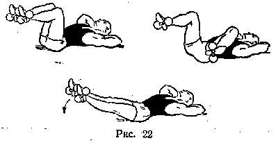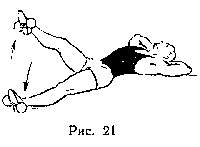 56-е упражнение (рис. 21). Лежа, кролеобразные движения ногами с прикрепленными к ним гантелями. Для мышц брюшного пресса.