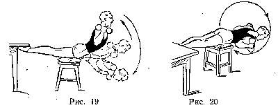 53-е упражнение (рис. 19). Прогибание туловища лежа на табуретке, стульях лицом книзу. Для мышц спины.
