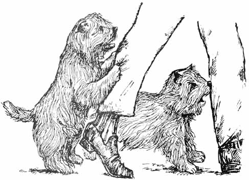 – Лежать! Лежать! – взвыл я, как всегда, но два уэст-хай-ленд-уайт-терьера продолжали, стоя на задних лапах, передними яростно царапать мои голени. (Выше они не дотягивались.) Возможно, кожа у меня на голенях особенно нежная, судить не берусь, но ощущение было мучительнейшим.