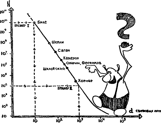 Помня об экономии сил и времени читателя, мы не будем углубляться в методику оценок, сделанных другими учеными. Приведем их в окончательном виде, пользуясь графиком, предложенным австралийским астрономом Р. Брейсуэллом. Строится он так. Во-первых, задаемся различным произвольным числом одновременно существующих цивилизаций N в Галактике. На графике N взято в гигантском диапазоне от 10 до 1010. Во-вторых, для выбранных значений вычисляется, зная объем Галактики, среднее расстояние между цивилизациями d. При этом полагаем равномерное их размещение.