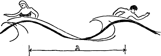 Что же есть ? Перенесемся мысленно на море. Плавая на морских волнах, вы чуть-чуть поссорились со своей подругой. Пребывание вместе на одном гребне волны стало принципиально невозможным. Ваша подруга переместилась на соседний гребень. Теперь расстояние между поссорившимися равно (при крупных ссорах дистанция в одну , вероятно, будет недостаточной). Итак — это расстояние, которое волна пробегает за время одного цикла или одного периода колебаний в среде, и называется длиной волны.